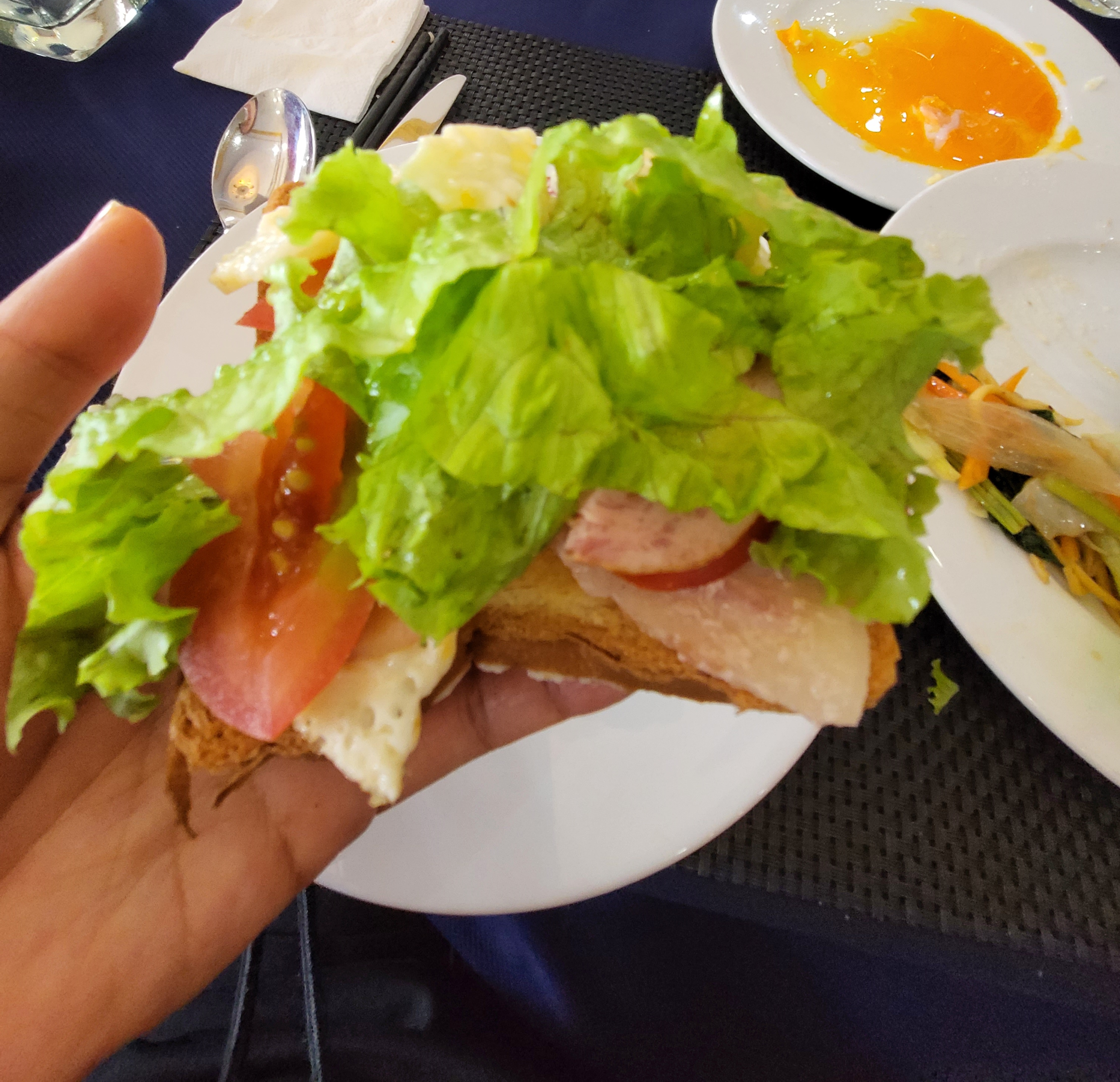 매일 먹었던 건 맛있는 식빵과 버터, 잼 조합과 식빵과 계란, 토마토, 베이컨, 계란, 상추 조합이었어요.