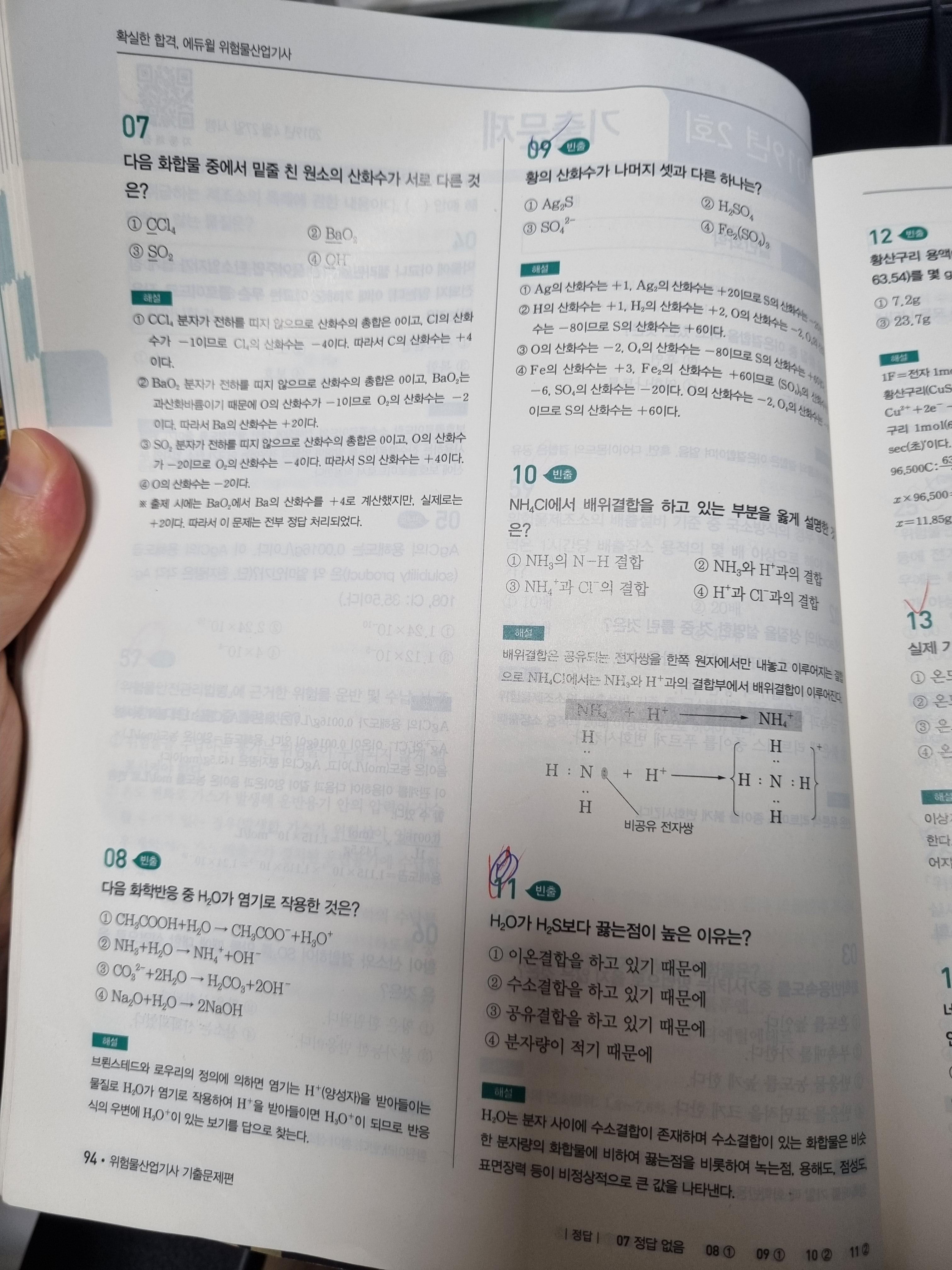 이렇게 화학이 아닌 문제도 비중이 많기 때문에 답만 잘 외워도 과락은 피할 수 있습니다. 위의 왼쪽 사진 2번처럼 산화수 문자는 그냥 외우면 됩니다! 외우다 보면 대략 산화수 계산하는 방법도 터득하게 됩니다. 시험에 꼭 나오는 문제니 저렇게 빈출 유형만 정확히 알고 가면 화학에서 오히려 고득점이 나오게 됩니다. 정말 어려운 건 3과목입니다. 외울 게 정말 많습니다.....